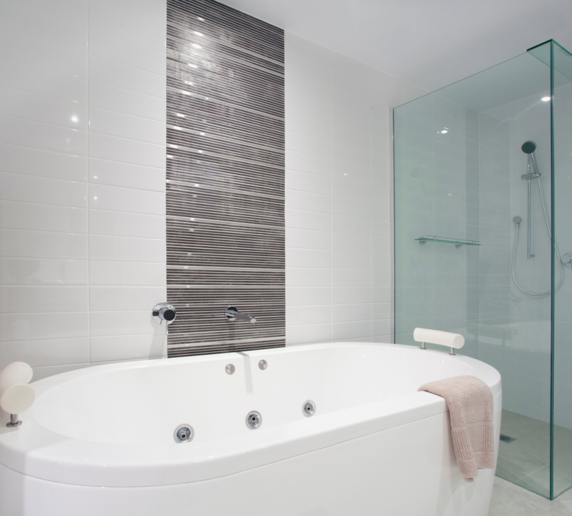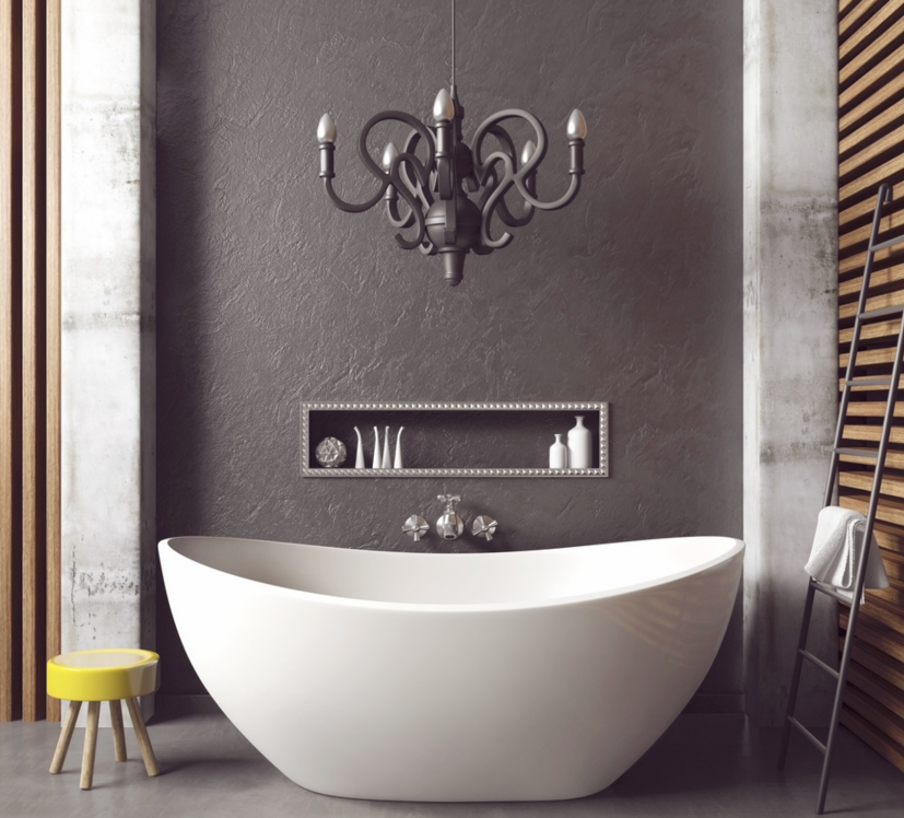 Design elements: Art Deco fan style backsplash, stand alone soaking bathtub, brushed gold accessories