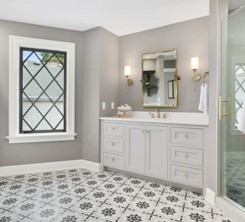 Design elements: Art Deco fan style backsplash, stand alone soaking bathtub, brushed gold accessories